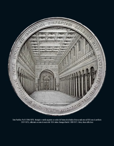 Stato Pontificio. Pio IX (1846-1878). Medaglia in metallo argentato con veduta dell’interno della Basilica Ostiense realizzata nel XXIX anno di pontificato