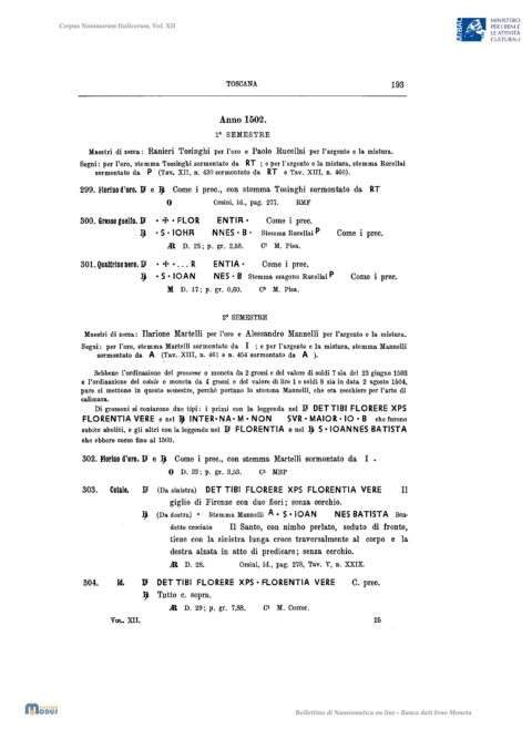 Segni: per l'oro, stemma Martelli sormontato da I ; e per l'argento e la mistura, stemma Mannelli