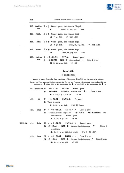 Maestri di zecca: Lutozio Nasi per l'oro e Bernardo Rucellai per l'argento e la mistura.