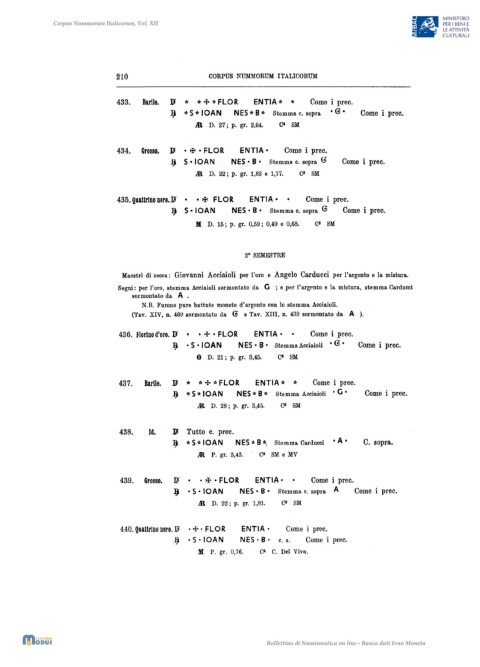 Maestri di zecca: Giovanni Acciaioli per l'oro e Angelo Carducci per l'argento e la mistura.
