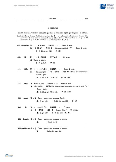 Segni: per l'oro, stemma Canigiani sormontato da F ; e per l'argento e la mistura, stemma Spini