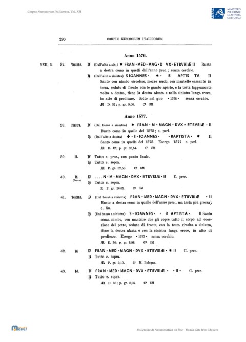 XXII, 3. 37. Testone. ]p (Dall'alto a sin.) * FRAN • MED· MAG· D VX· ETRVRI.E " Busto
