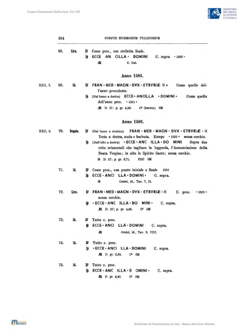 XXII, 7. 69. Id. ]p FRAN· MED • MAGN • DVX • ETRVRIA: Il o Come quelle deI-