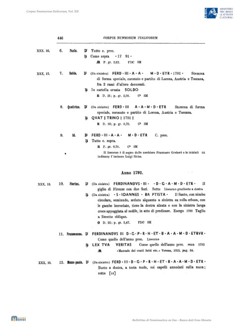 XXX, 17. 7. Soldo. 11 (Da. sinistra.) FERD· III • A • A • M • D • ETR • 1791 • Stemma